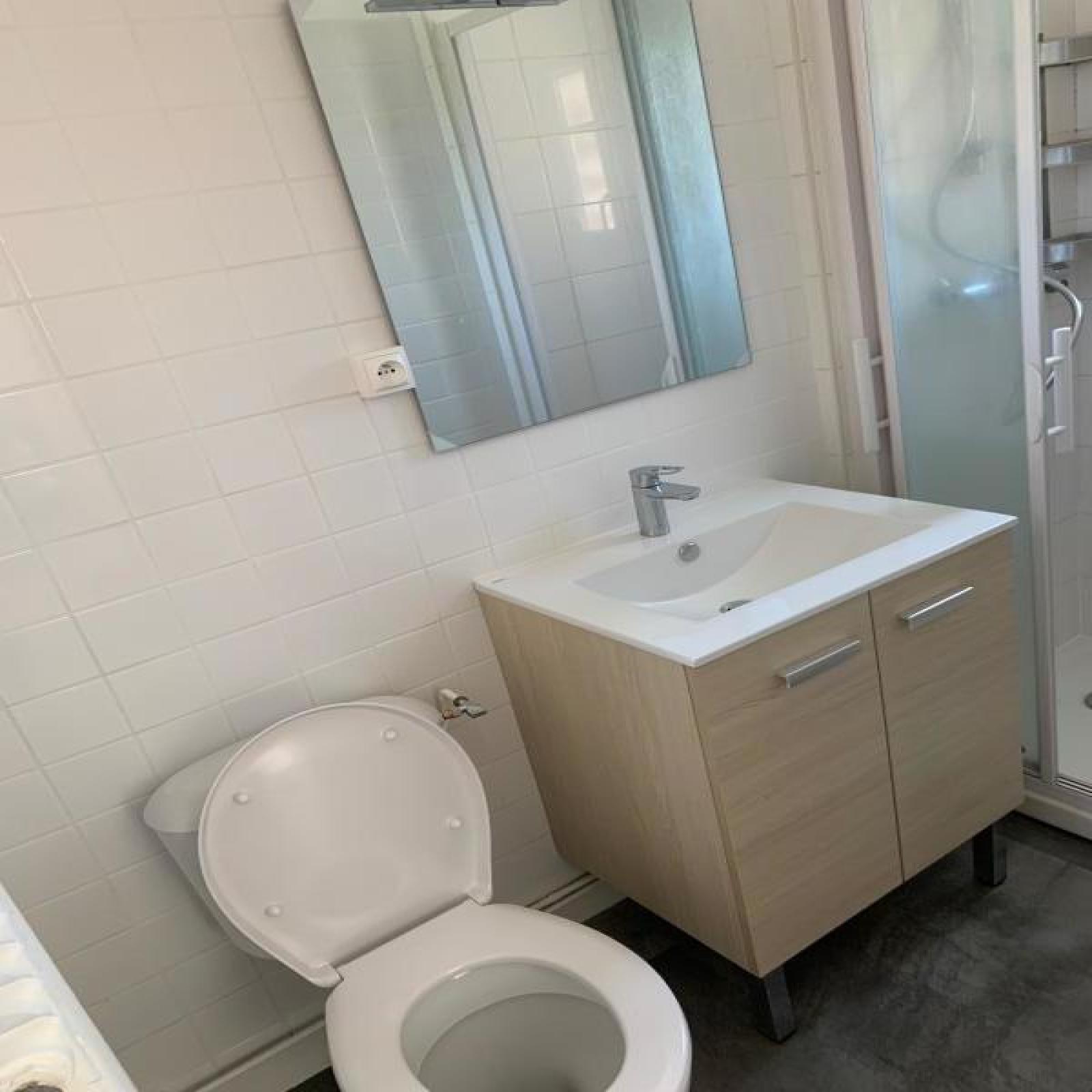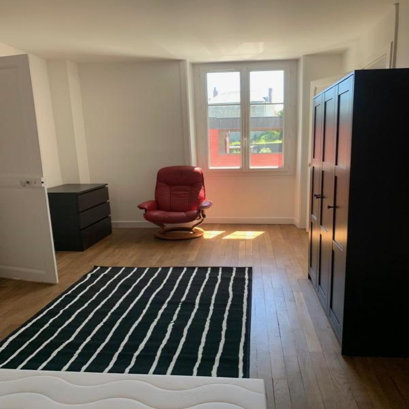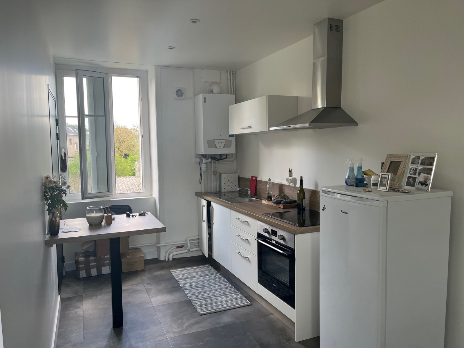 LAVAL, à proximité du centre-ville un grand type 2 rénové et meublé comprenant une cuisine aménagée et équipée avec un coin repas, un salon/séjour sur parquet et une grande chambre d'environ 20 m², une salle d'eau avec douche et WC.