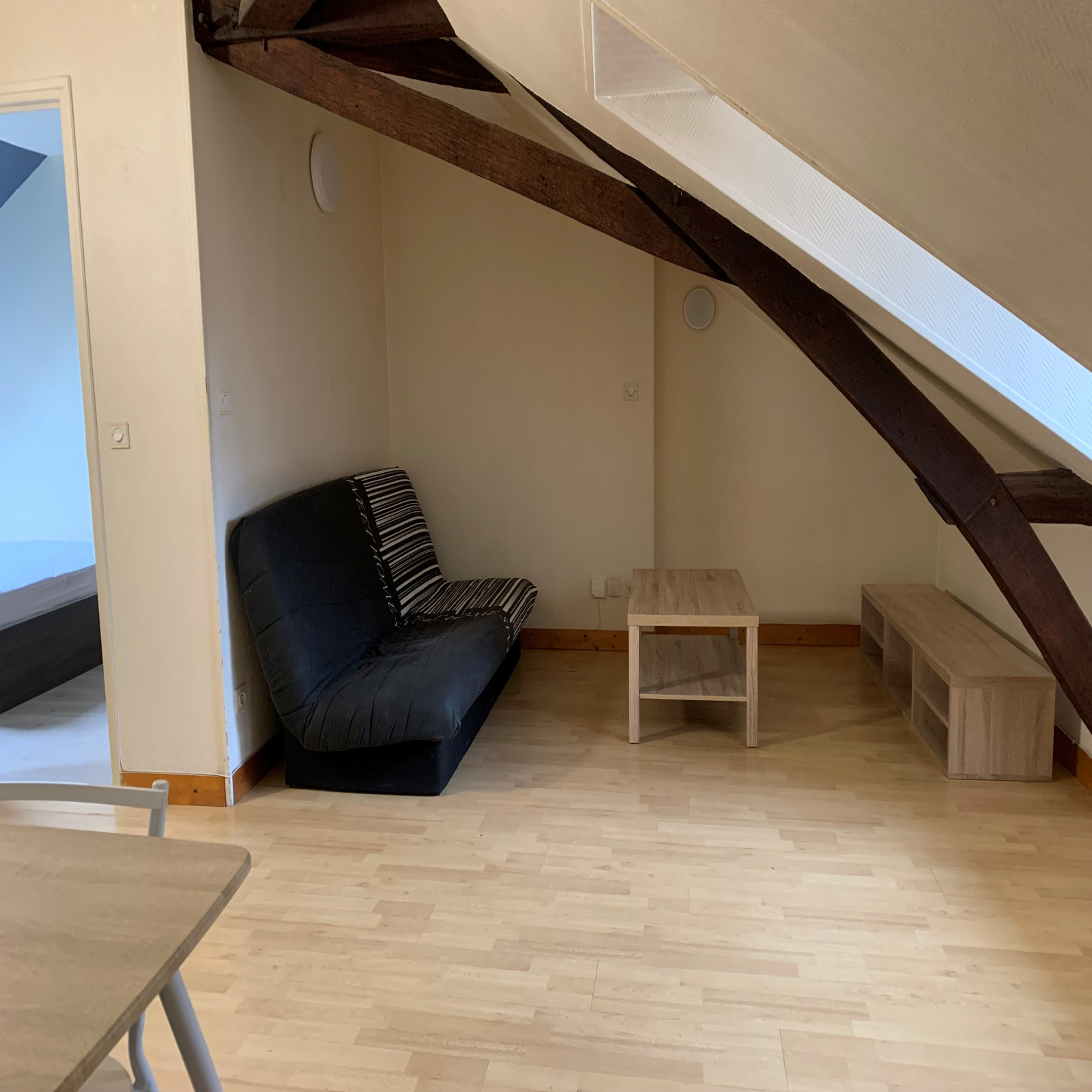 Appartement type 2 meublé mansardé (bail en vide avec prêt de meuble) : séjour, kitchenette séparée, chambre, salle d'eau, wc. Chauffage électrique. Eau et EDF individuels.