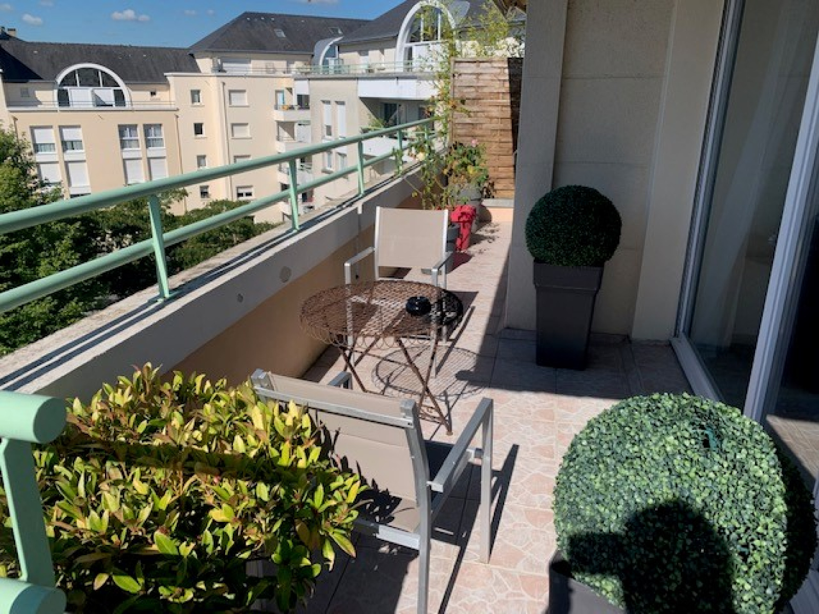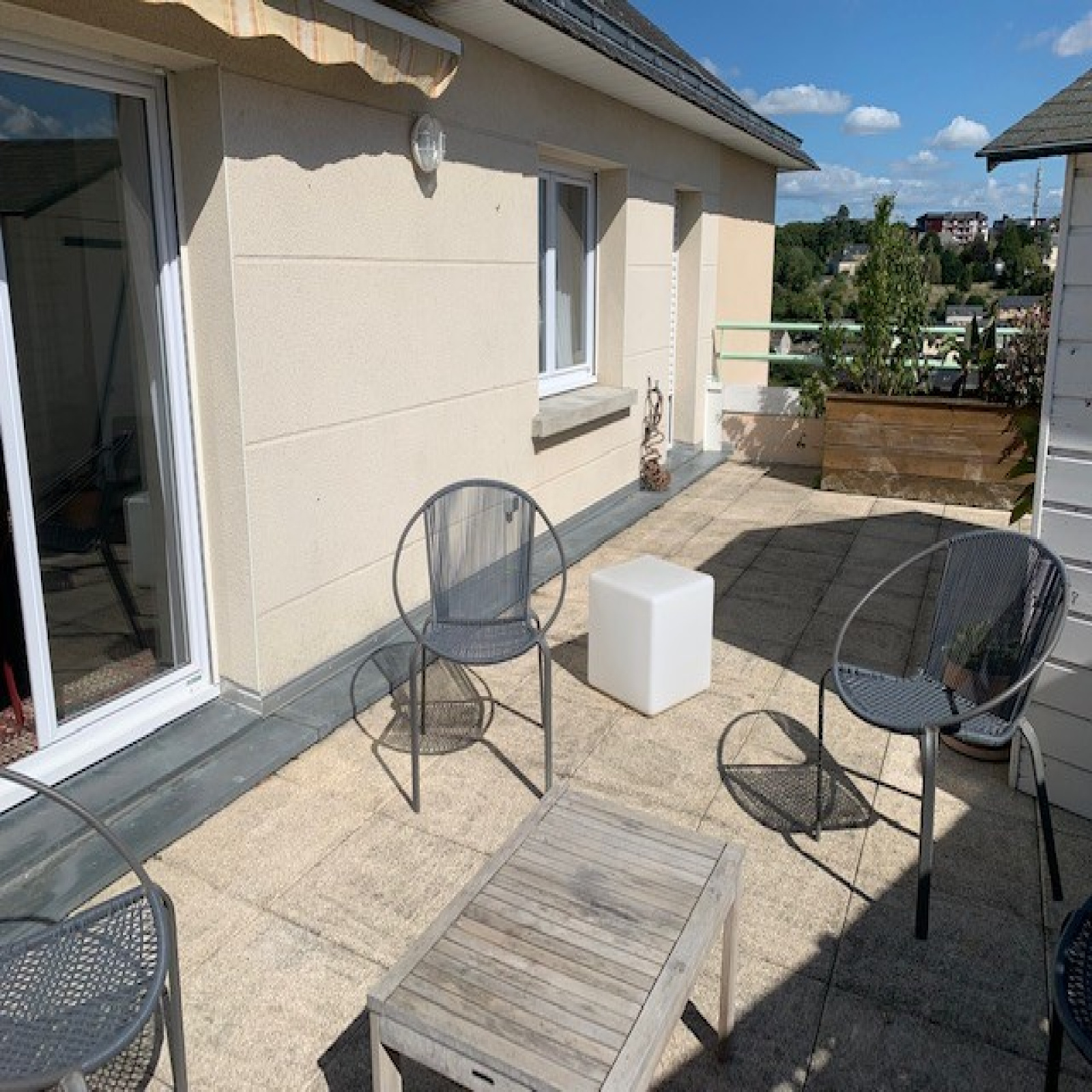 Appartement situé au 5ème et dernier étage d'une résidence de standing : entrée avec placards, séjour-salon, cuisine aménagée, 2 chambres, une salle d'eau, WC séparé, une terrasse de + 50m2 qui donne sur une vue à 360° sur la ville de Laval. Garage en sous-sol. Chauffage gaz de ville à la charge du locataire