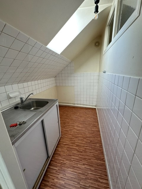 Studio mansardé : entrée, belle pièce à vivre, petite cuisine séparée, salle de bains, wc séparé. Chauffage électrique (vélux double vitrage).