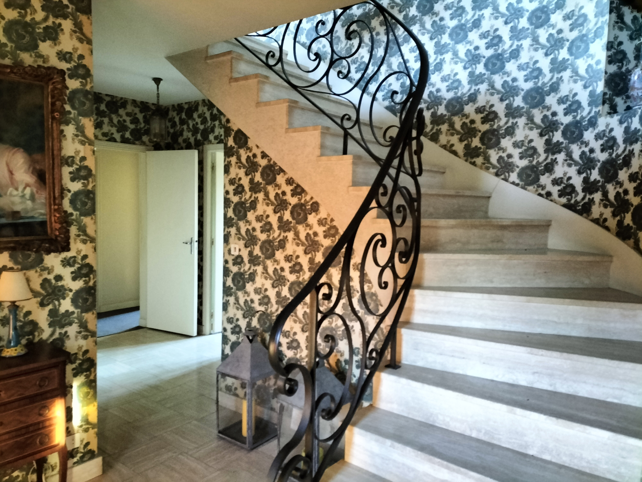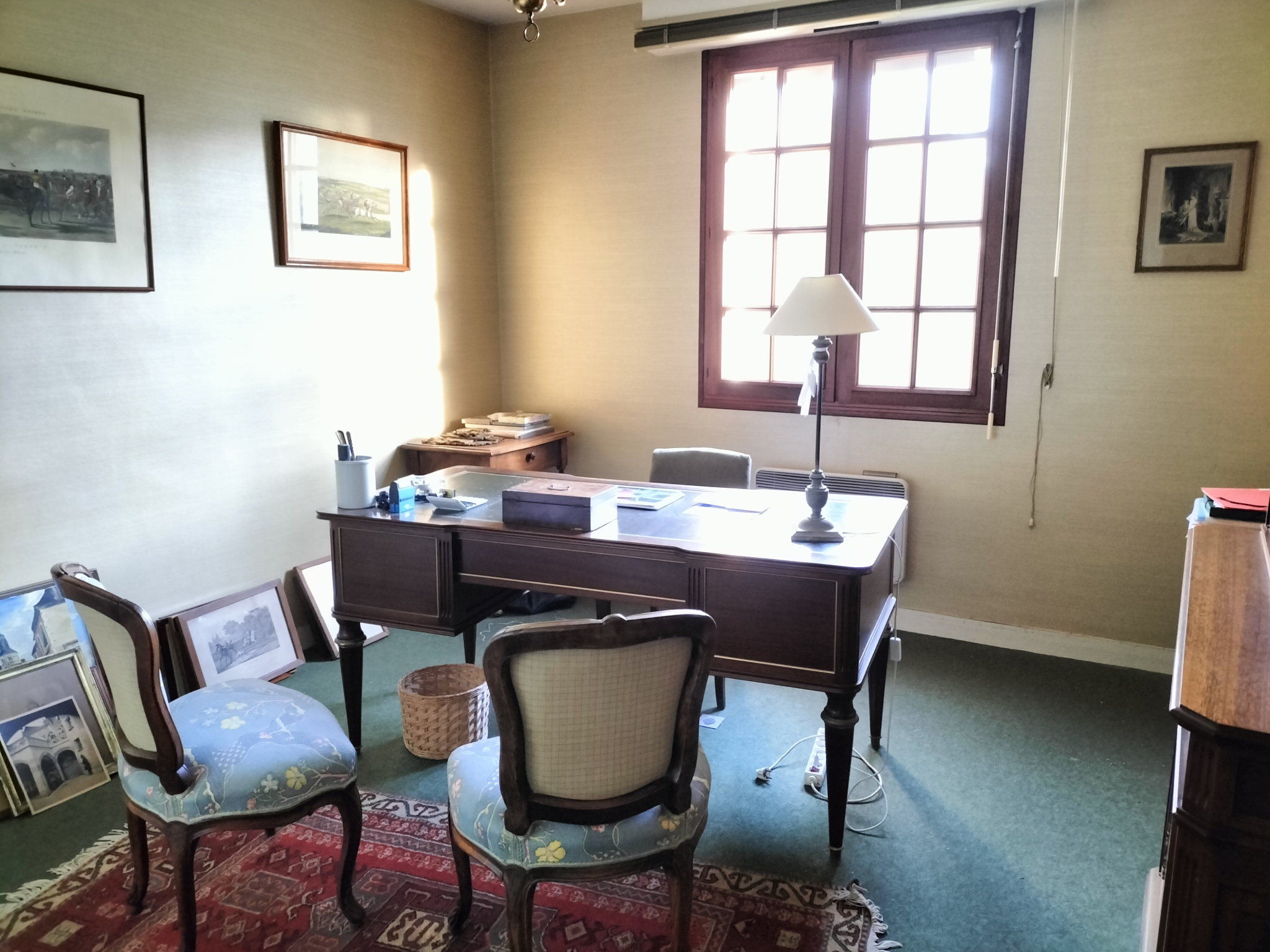 Il offre au rez-de-chaussée une vaste entrée sur travertin, un séjour-salon lumineux de 40 m² avec cheminée insert, une cuisine indépendante, une chambre, un bureau et un WC.