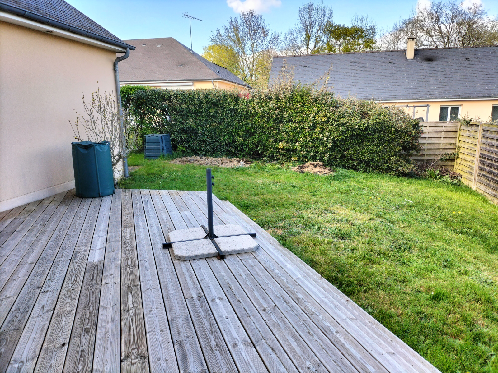 Le tout est implanté sur un terrain clos de 497 m² avec une terrasse en bois.